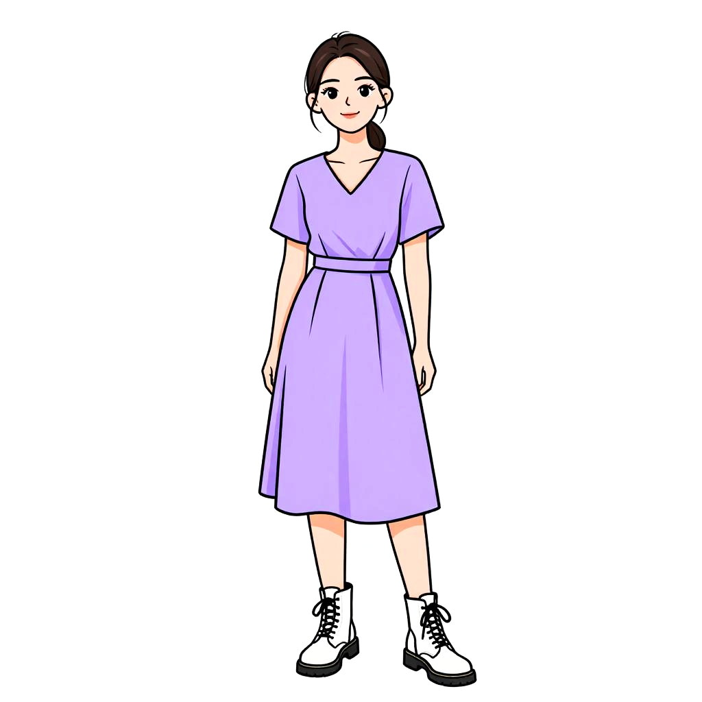 Digital drawing of an East Asian woman with pale skin and dark brown hair in a simple ponytail. She wears a lilac V-neck dress with short sleeves and a belted waist, falling to mid-thigh. She has black lace-up shoes with white soles. Her expression is neutral, with small, black, almond-shaped eyes and a subtle smile. The background is plain white, emphasizing her figure. The art style is clean and minimalistic, with bold outlines and flat colors, reminiscent of Japanese manga or anime character designs.