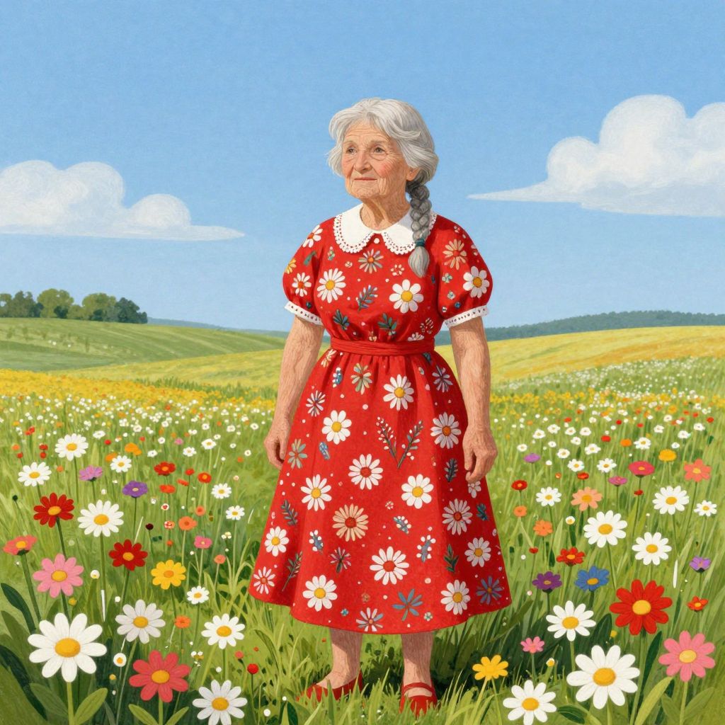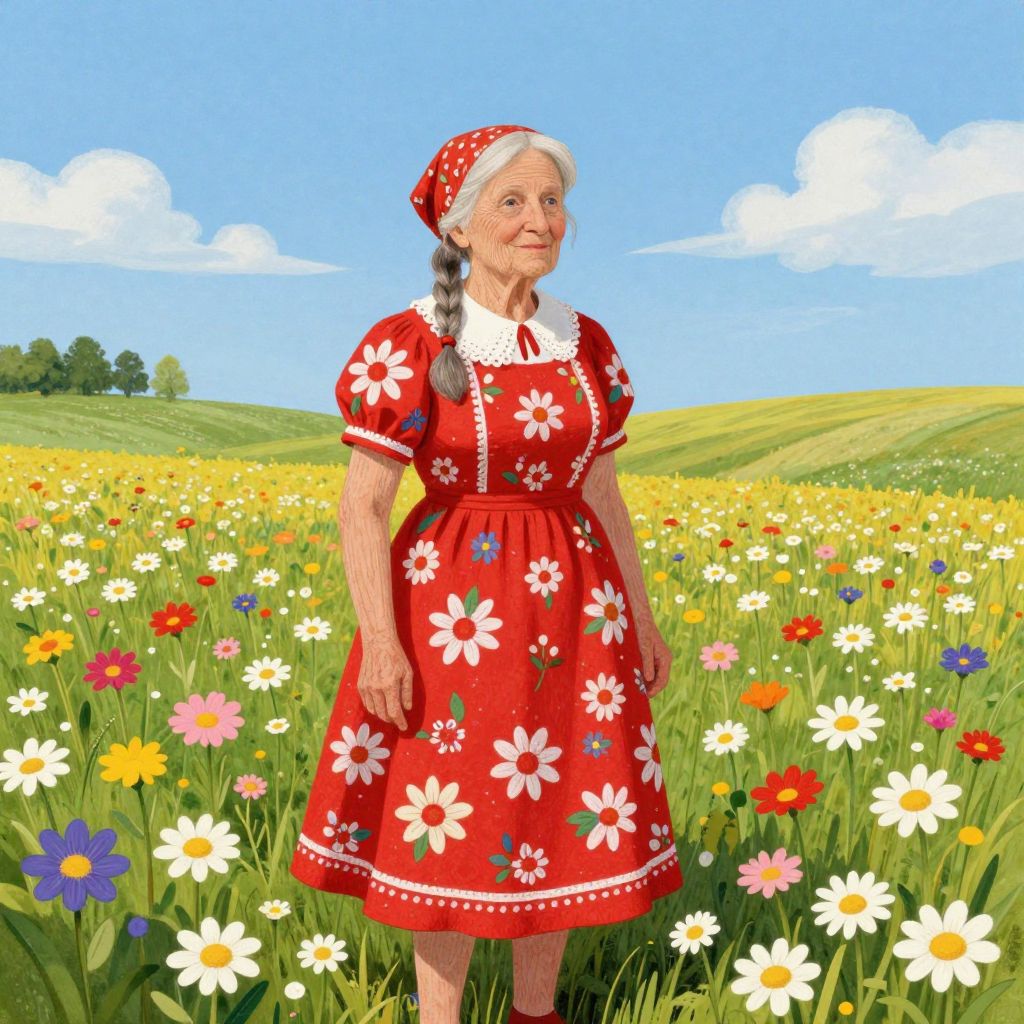 Digital illustration of an elderly white woman with white hair, wearing a red floral dress, standing in a vibrant meadow of colorful wildflowers under a bright