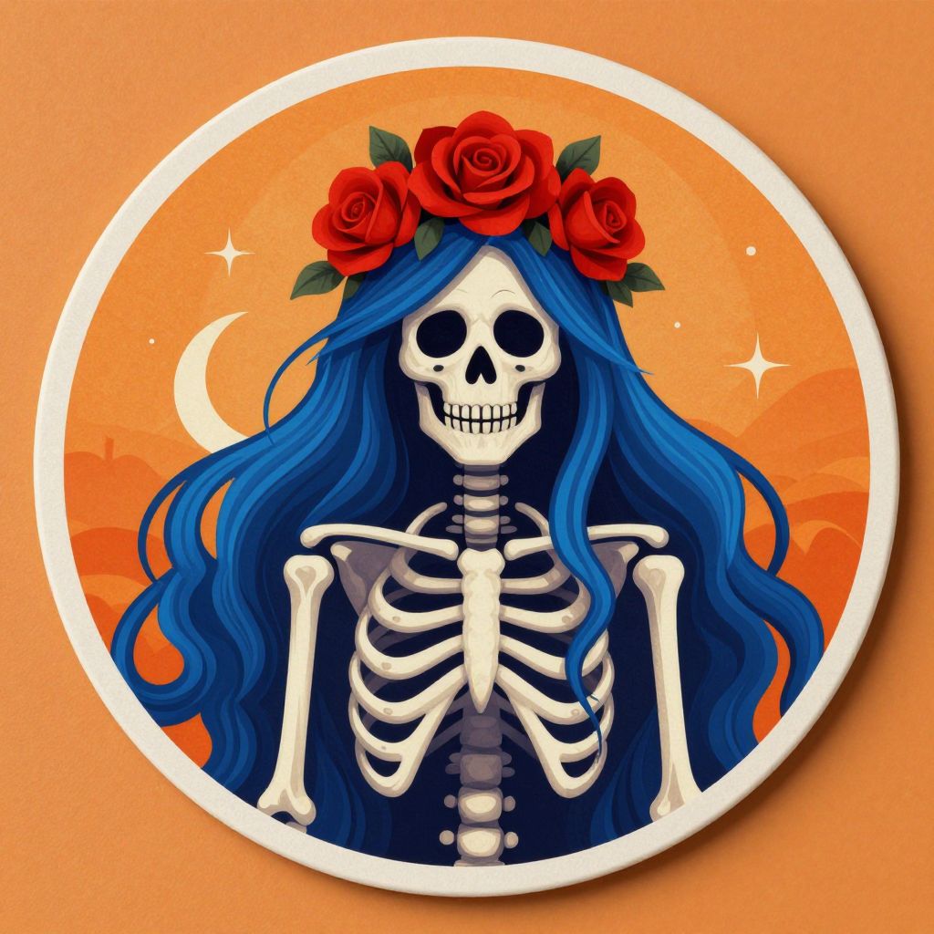 Colorful cartoon flower with a skull face, surrounded by vibrant purple, green, and orange plants, and a pumpkin with a smiley face. Digital