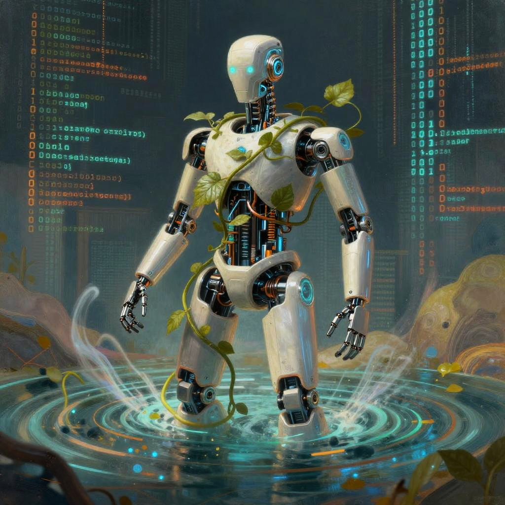 AI transformation art illustrating a robotic figure emerging from a pool of digital code, integrating nature-inspired motifs like leaves and vines intertwining with circuits, warm and cool color contrasts, dynamic motion blur effect, imaginative digital painting.