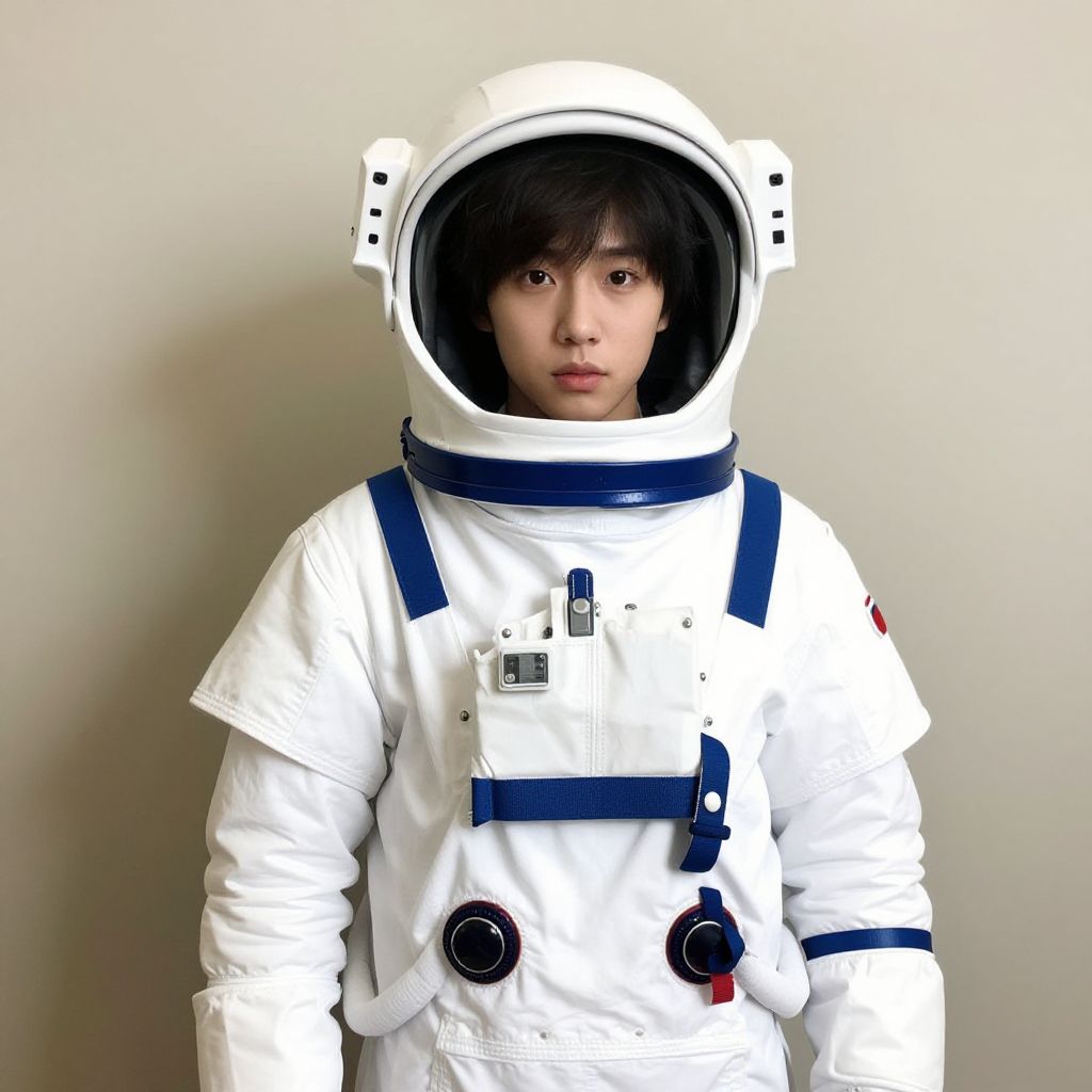 Photograph of an East Asian young man standing against a plain, light gray background. He wears a full, white astronaut suit with a large, clear visor helmet, exposing his short, dark brown hair and serious expression. The suit has blue straps, black circular buttons, and a small red patch on the right sleeve. His hands are in the suit's pockets, and the suit's texture appears slightly puffy and padded. The lighting is even, highlighting the suit's bright white color and the man's calm, focused demeanor.