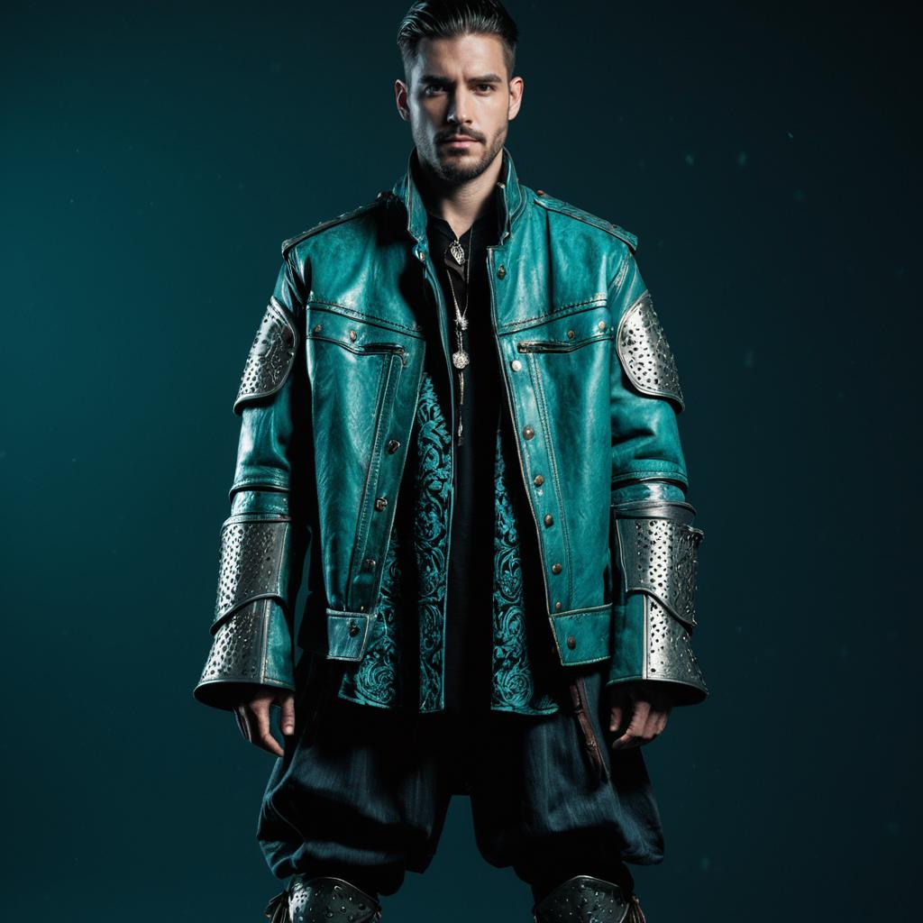 Male Model in Teal Medieval-Inspired Leather Jacket