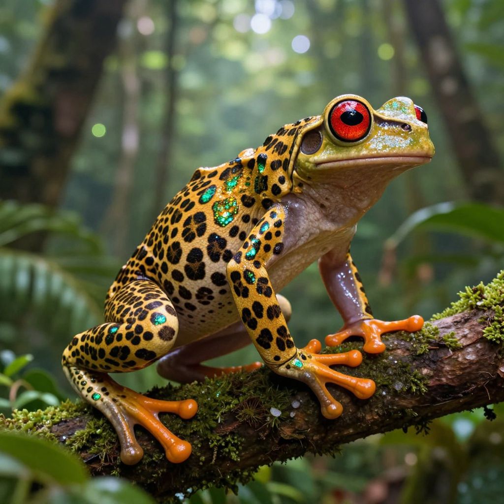 In a breathtaking display of imagination, envision a hyper-realistic 8K hybrid creature that seamlessly fuses the formidable strength of a leopard with the vivid characteristics of a tree frog, This extraordinary being boasts a sleek, muscular physique of a leopard adorned with a golden coat, intricately patterned with shimmering leopard spots that reflect iridescent shades of green and blue, Its legs are gracefully elongated, ending in distinctive webbed orange toes reminiscent of a tree frog, providing remarkable agility for climbing, The creature’s striking large eyes glow a vibrant red, echoing the captivating gaze of a tree frog, while its back features a subtle, glossy sheen that mirrors the moist texture of amphibian skin, Perched elegantly on a moss-covered branch within a lush tropical rainforest, it is surrounded by a rich tapestry of greenery, illuminated by soft rays of sunlight filtering through the dense canopy, The scene is alive with vibrant colors, magical elements, and an enchanting atmosphere that exudes both mystery and power