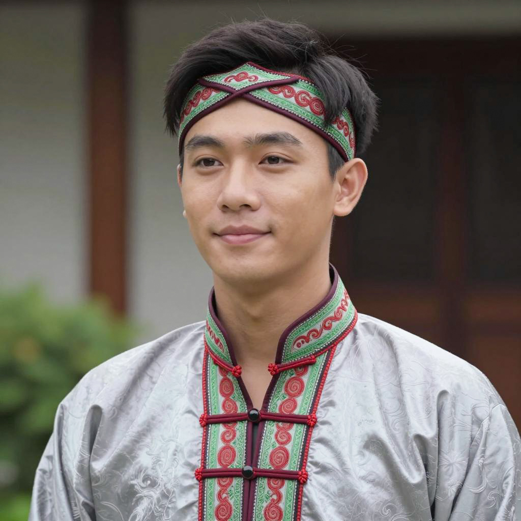 Asean costume male, photograph of an Asian man with fair skin, short black hair, wearing a traditional silver-gray Chinese-style tunic with intricate red and green patterns, a matching headband with similar patterns, slightly smiling, soft natural light, blurred background with greenery and wooden structure, portrait orientation, realistic, close-up, upper body shot, calm expression