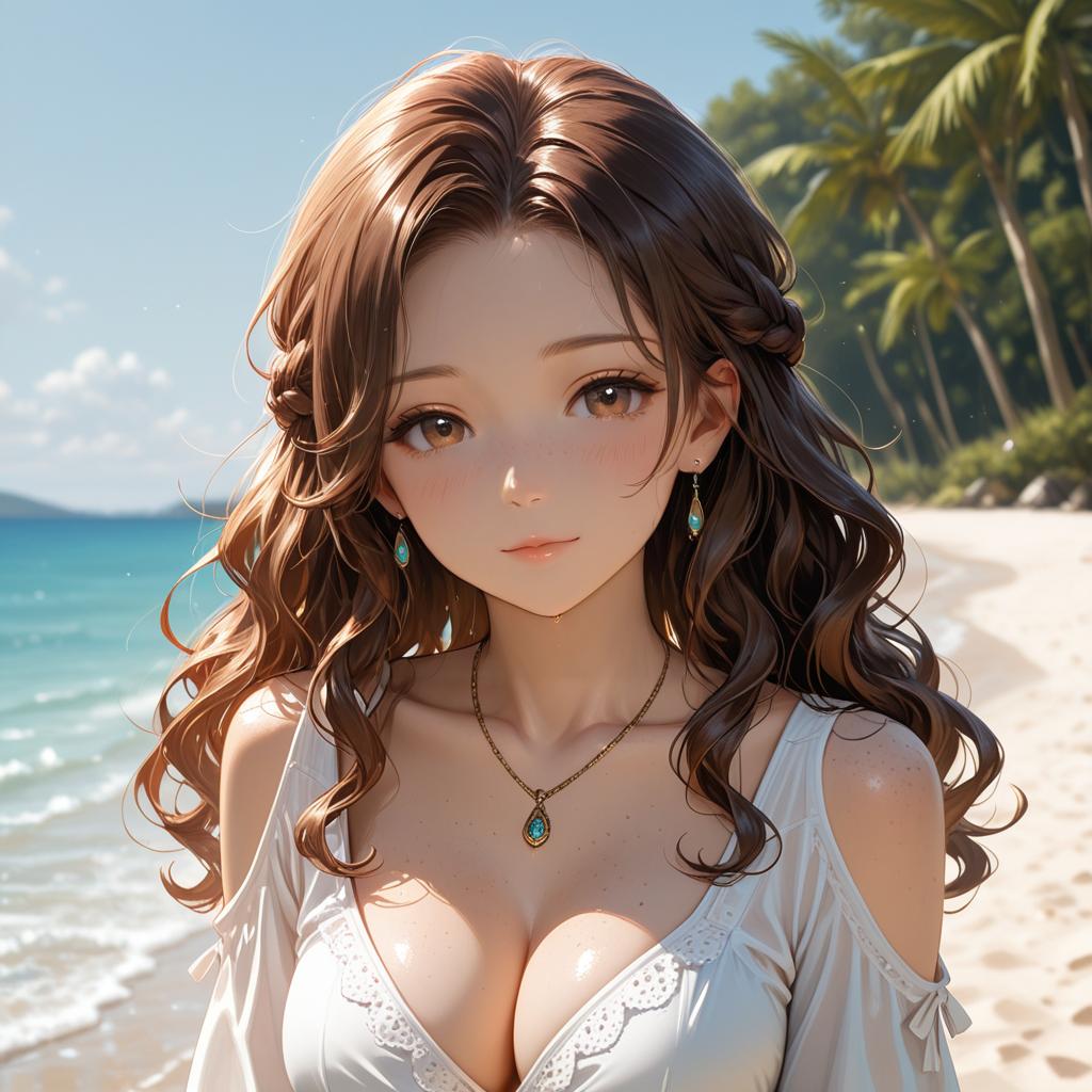 Digital artwork of an anime-style girl with long black and brown hair, wearing a white fur-trimmed coat over a patterned white dress, standing outdoors in a snowy mountain landscape surrounded by pine trees. The girl has brown eyes, wears dangling earrings and a necklace, and has a gentle expression with closed lips. The background features snow-covered mountains under a clear blue sky.