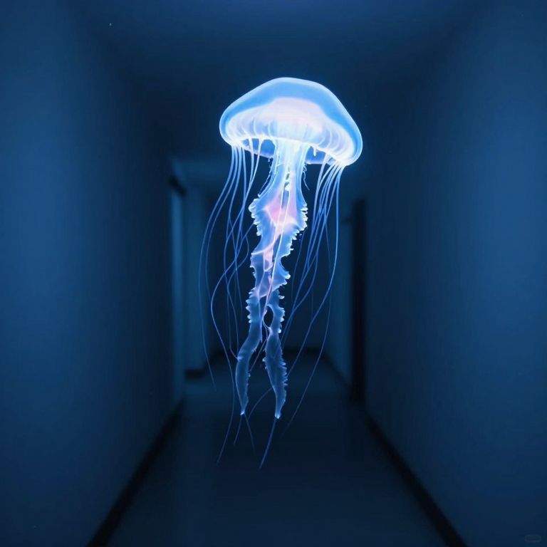 Photograph of a glowing, bioluminescent jellyfish floating in a dark, narrow hallway. The jellyfish has a translucent, dome-shaped bell with bright blue and pink hues, and long, flowing tentacles that trail downwards. Tiny, sparkling particles surround the jellyfish, adding to the ethereal effect. The hallway is dimly lit, with dark wooden doors on either side and a tiled floor that reflects some of the jellyfish's light. The overall scene is surreal and mesmerizing, creating a contrast between the bright jellyfish and the dark, shadowy background.