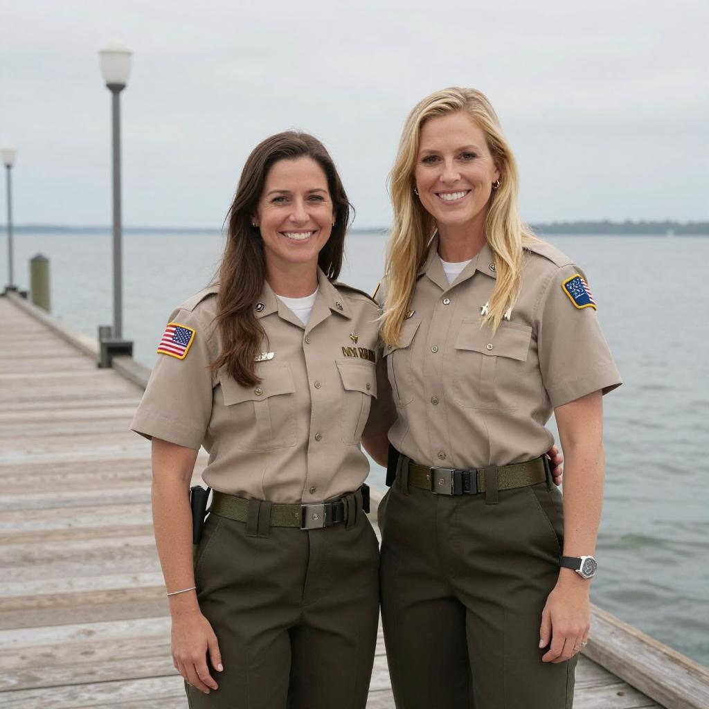 Photograph of two women in uniform standing on a pier by the sea. The woman on the left has long brown hair, tan uniform, and black pants, with an American flag patch on her sleeve. The woman on the right has long blonde hair, tan uniform, and black pants, with a small "M" patch on her belt. They are smiling and standing close, with the woman on the right's arm around the other's waist.