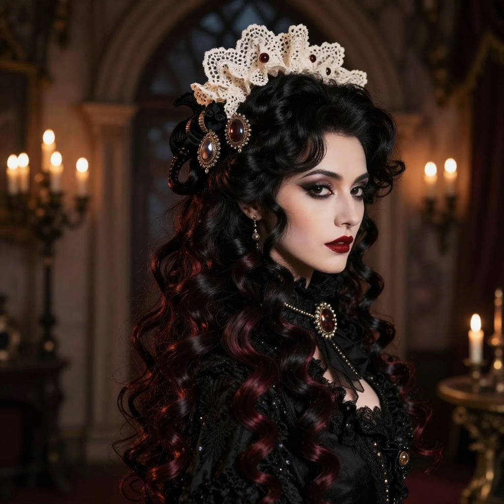 Victorian vampire hair styled in intricate curls and waves, deep ebony with a subtle crimson sheen, framed by delicate lace headpieces and antique jeweled pins, set against a dimly lit, gothic Victorian mansion background with flickering candlelight.