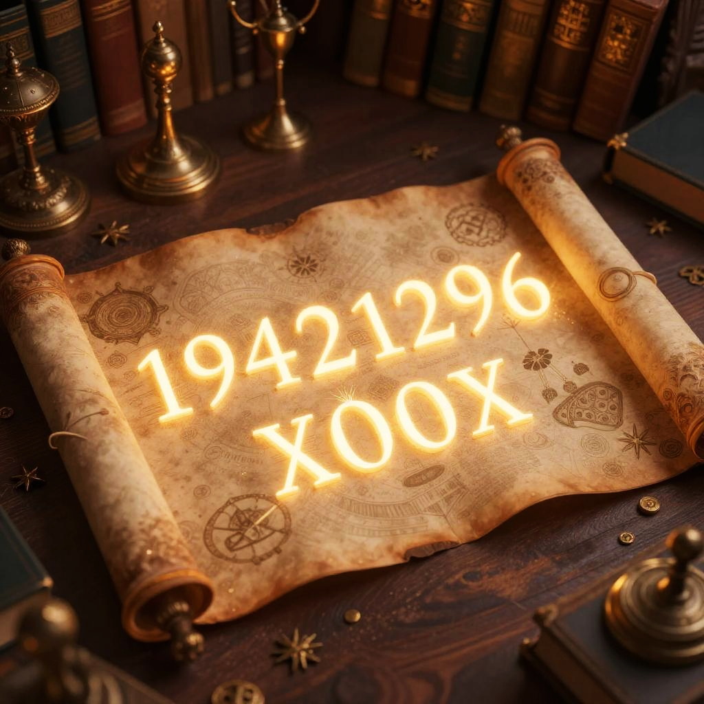 19421296 illustrated as a glowing alphanumeric sequence written in glowing symbols on a mystical ancient scroll, set in a dimly lit library filled with old books and magical artifacts, warm color palette.