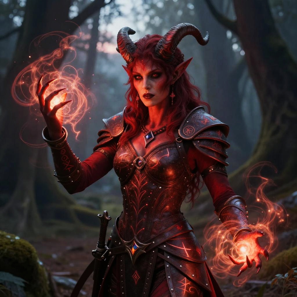 A digital fantasy artwork depicts a dark, armored warrior with glowing red eyes and a wide-brimmed black hat. The warrior, clad in metallic armor with a fur collar, wears a red cape and a skull pendant on their chest. They hold a fiery, orange flame in their right hand. The background is a misty, rain-soaked forest with fallen logs and dark, twisted trees. The scene is dramatic, with a focus on the warrior's intense, otherworldly presence. The image has a high-contrast, dark fantasy style with detailed textures and vivid colors.