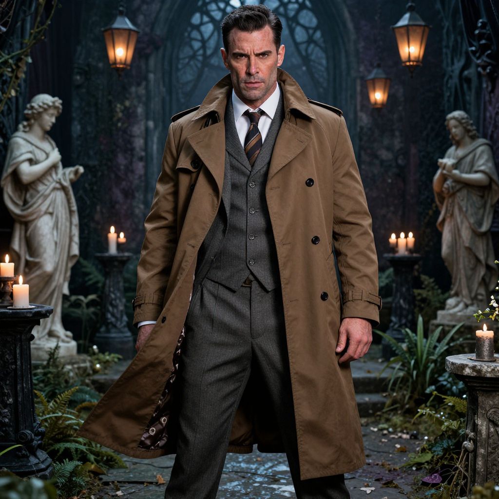A tall, confident man with a strong jawline, weathered complexion, and deep brown eyes dons a stylish brown trench coat styled like a 1940s secret agent for a Halloween costume, standing in a gothic garden with candlelit statues and floating lanterns, the coat flaring slightly in a breeze