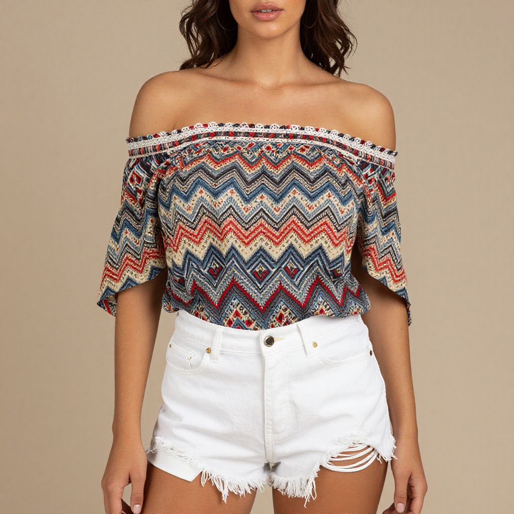 "Woman, bohemian, off-the-shoulder top with ruffle overlay, zigzag and geometric print in red, blue, and cream tones, lace trim along the neckline, short flutter sleeves, paired with white denim cut-off shorts, frayed hem.. Sexy. Pretty face and beаutiful eyes. Big breasts."