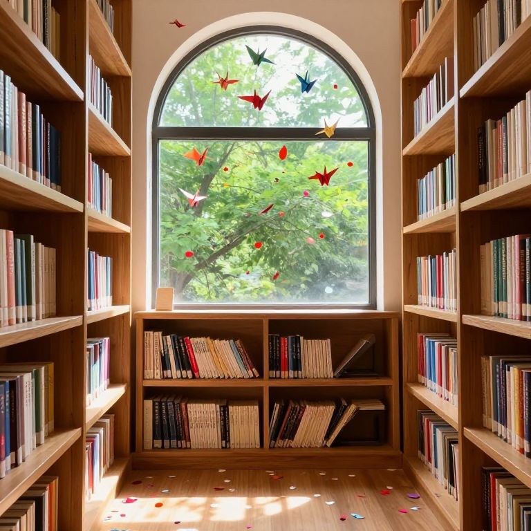 Books line wooden shelves in a cozy library, illuminated by natural light streaming through a large arched window showcasing lush green trees, while colorful paper cranes flutter above and vibrant confetti-like petals scatter across the floor, creating a whimsical and enchanting atmosphere.