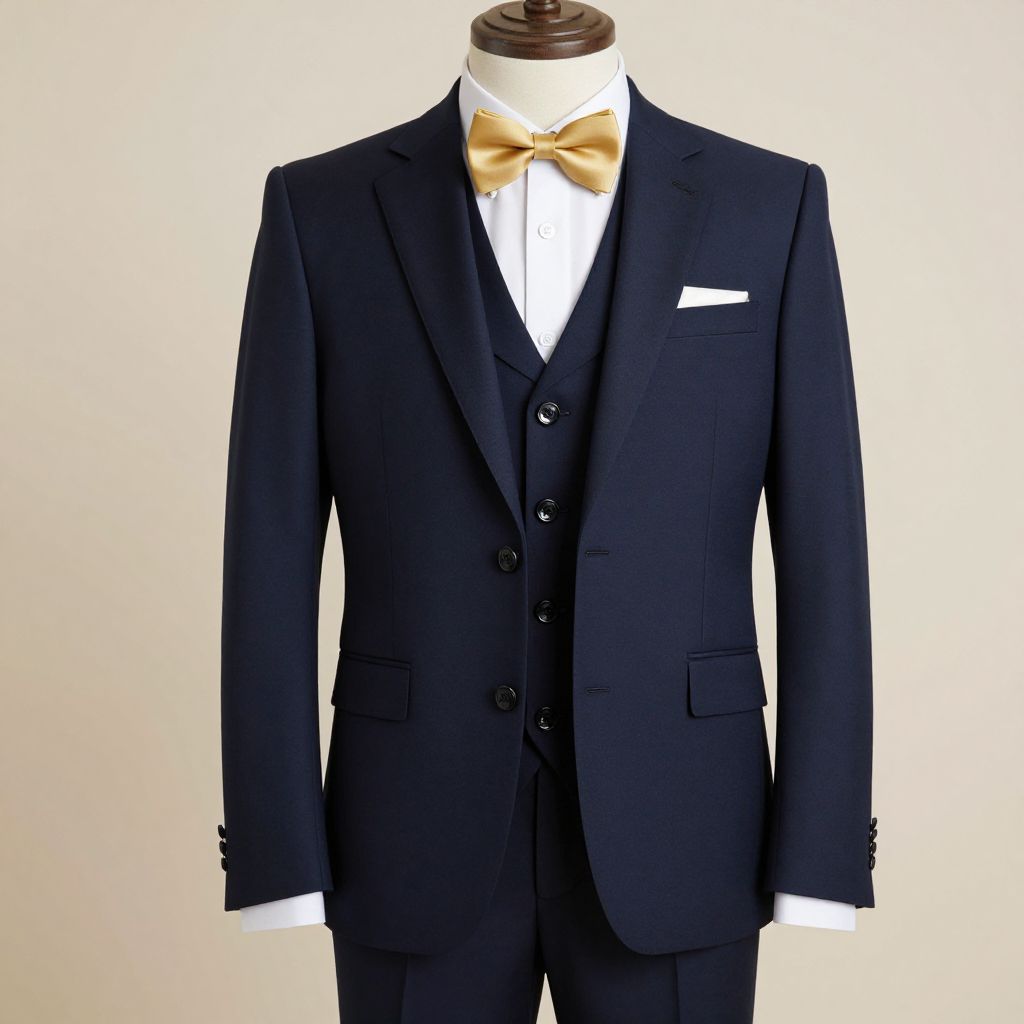 Elegant navy blue boys' formal suit ensemble displayed on a mannequin, featuring a matching vest, trousers, white shirt, golden bow tie, and pocket square, ideal for weddings, parties, or prom events.