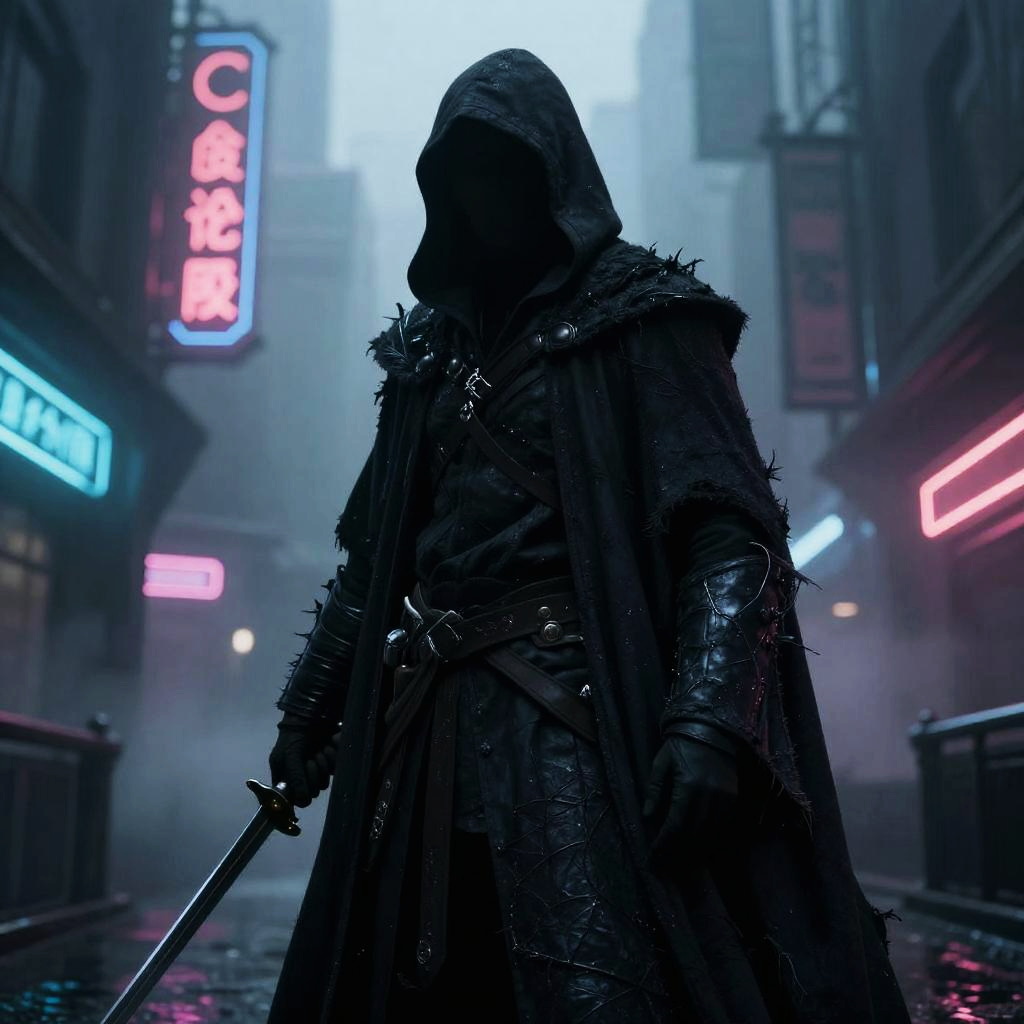 A mysterious figure dressed as an assassin wearing a dark, tattered cloak with subtle glowing veins. The character's face is obscured by a hood, standing in a foggy urban fantasy setting illuminated by neon signs and soft glowing lights. The assassin holds a sword and wears leather gloves and arm guards, blending into the shadowy, futuristic cityscape.
