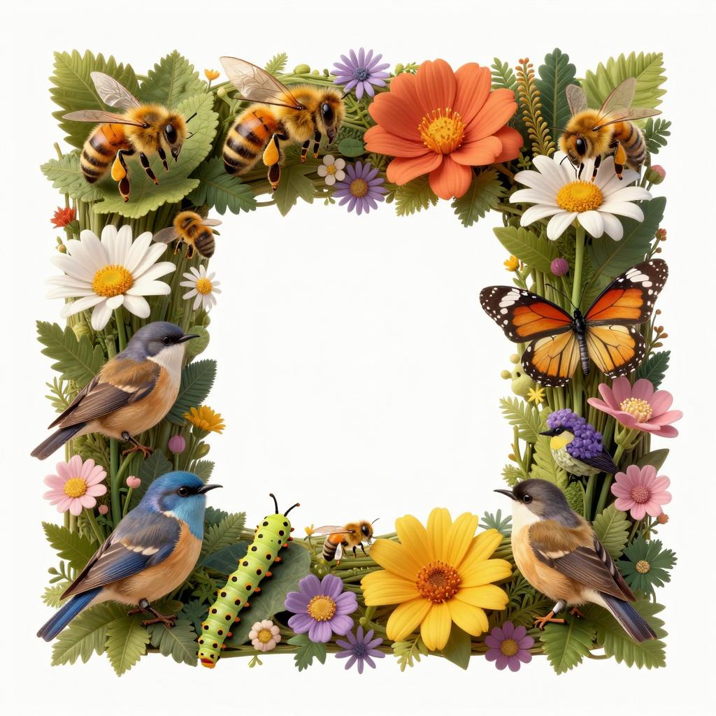 Floral and Wildlife Frame with Bees, Birds, and Butterflies