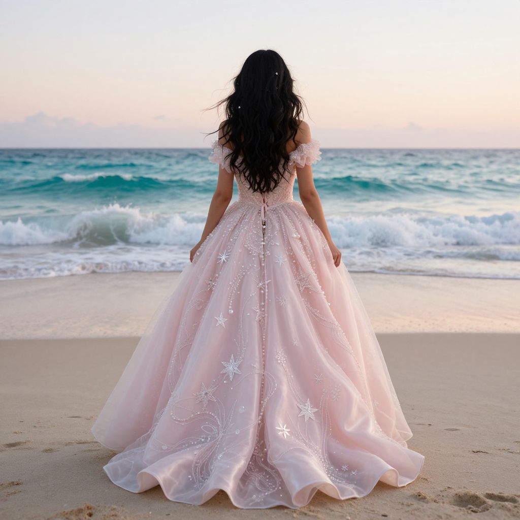 Photograph of a woman standing on a beach at sunset, facing the ocean. She has long, wavy black hair and wears a pink, full-skirted ball gown adorned with white star and floral embroidery. The gown has short, puffed sleeves. The beach has wet, reflective sand, and the ocean waves are visible in the background, with the sky displaying soft pink and blue hues. Her back is to the camera, emphasizing the intricate details of the dress and the serene beach setting.