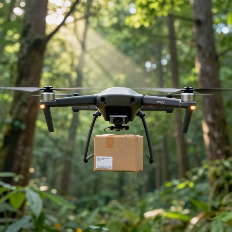 Volante drone flying over lush green forest, delivering a small package, realistic design with rotating propellers, sunbeams filtering through trees, detailed natural environment, hyperrealistic rendering