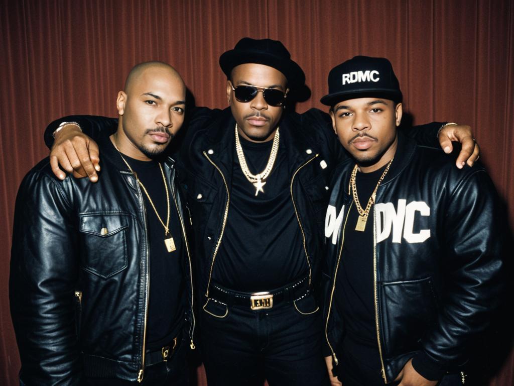 Run Dmc 80s face swap, man in a black jacket and black pants posing for a picture