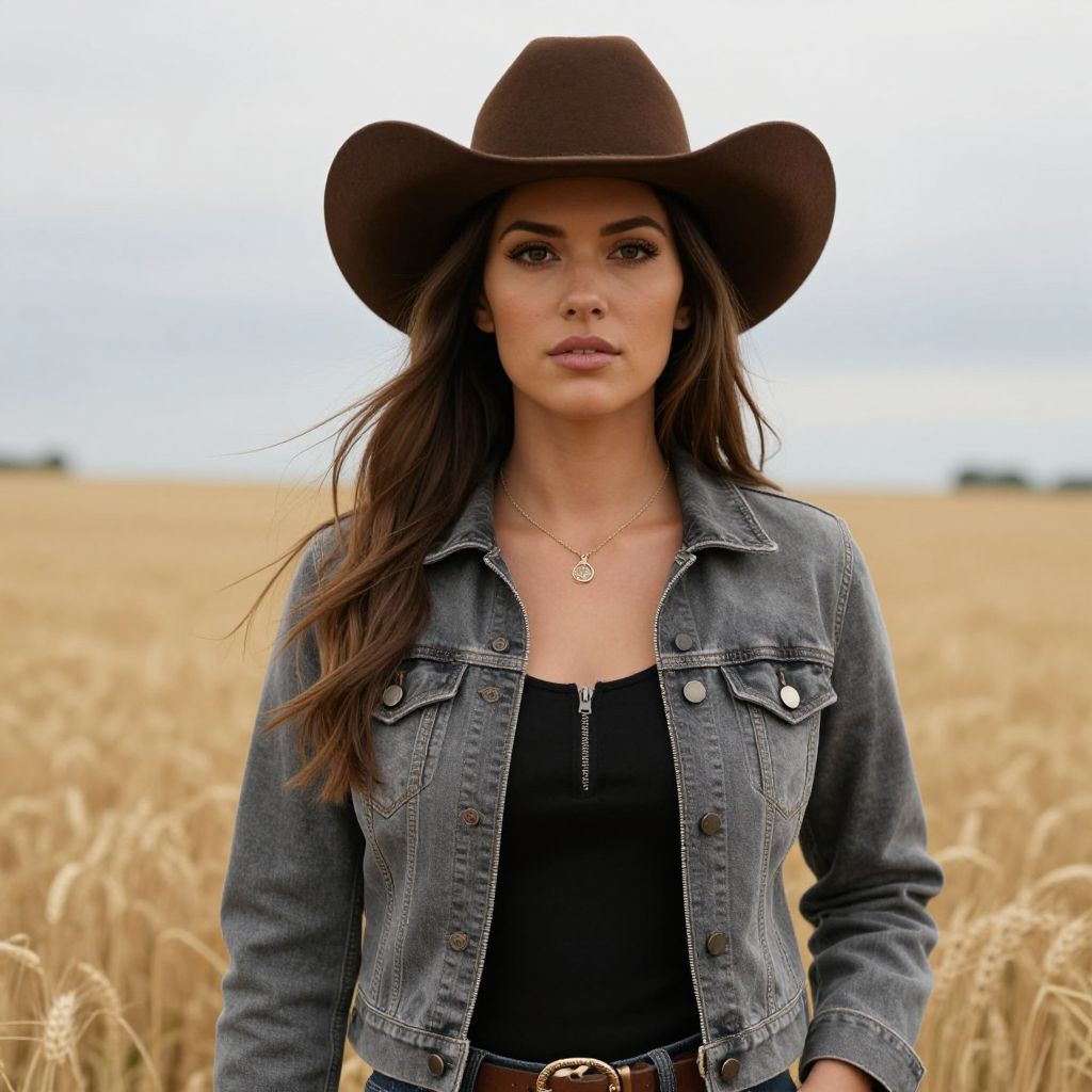 Tennessee woman stands confidently in a golden wheat field, wearing a wide-brimmed brown cowboy hat, a gray denim jacket over a black zip-up top, and a delicate necklace with a small pendant, her long brown hair flowing freely as she gazes directly at the camera against a cloudy sky backdrop.