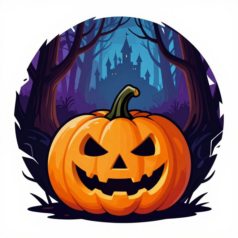 The image presents a vibrant and spooky Halloween-themed illustration, featuring a carved pumpkin with a mischievous face at the center. The pumpkin, with its orange and white hues, is surrounded by a circular frame that appears to be torn or cracked, revealing a forest scene inside. The forest is filled with tall, bare trees in shades of brown, purple, and blue, creating a eerie and mystical atmosphere. In the background, a castle-like structure emerges from the mist, adding to the haunted ambiance. The overall composition is clip art style, with bold outlines and a white background, making the colors and shapes stand out vividly. The interplay of colors and textures, along with the spatial relationships between the pumpkin, forest, and castle, creates a dynamic and engaging visual experience.