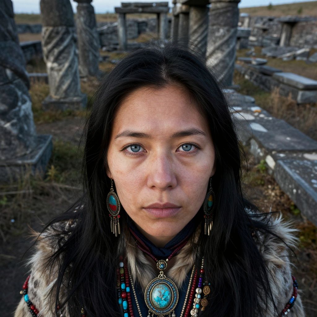 A captivating close-up portrait of an enigmatic Inuit woman with unfocused blue eyes and adorned in intricate tribal jewelry captures the viewer's attention from a unique bird's-eye view perspective. Ethereal lighting casts dramatic shadows across her angular features and cascading ebony hair, while her expression conveys a spectrum of emotions, ranging from intrigue to serenity. Set against ancient ruins with furrowed stone columns and overgrown vegetation, this evocative portrait exudes historical significance and otherworldly allure, inviting the viewer to delve into the depths of the subject's soul through their gaze.