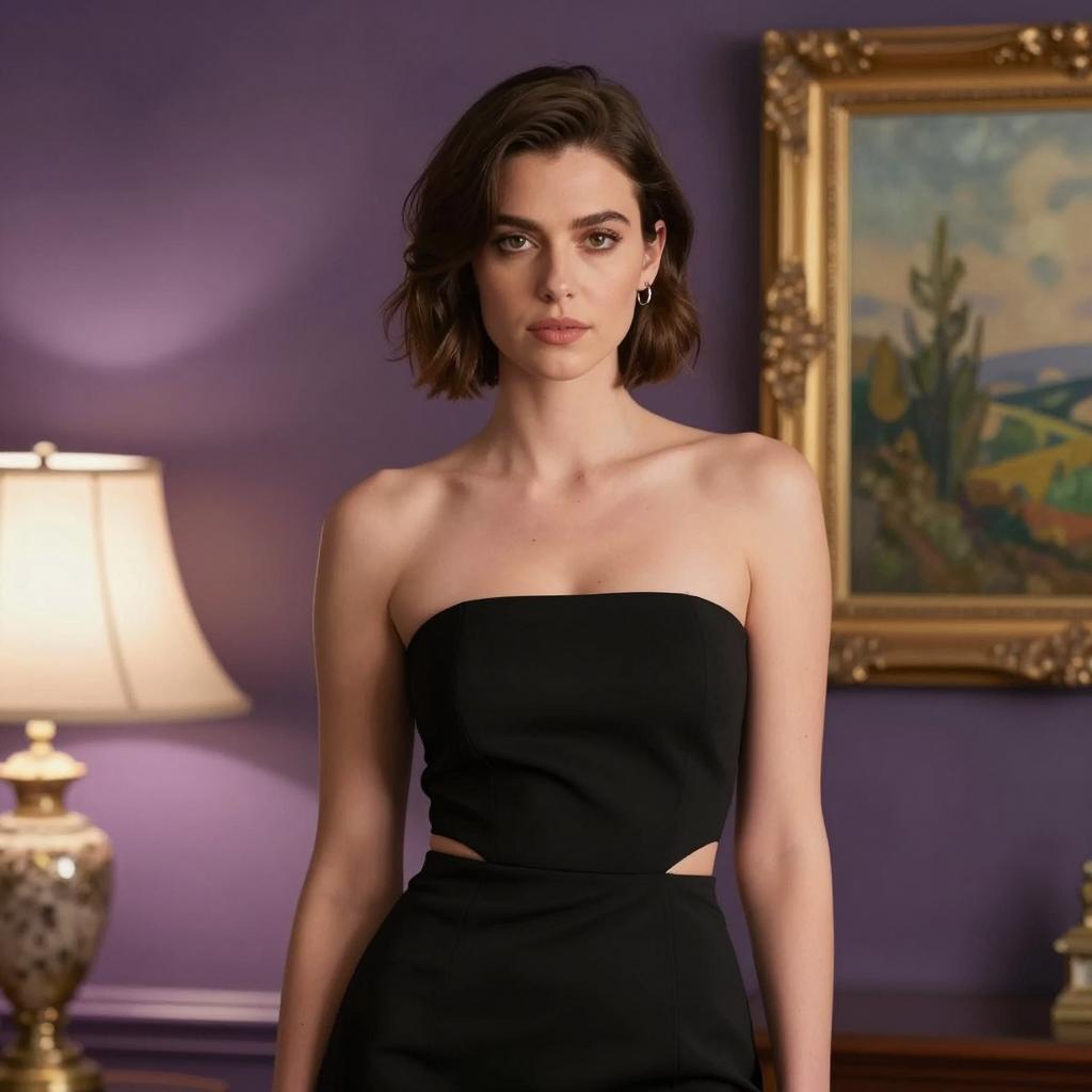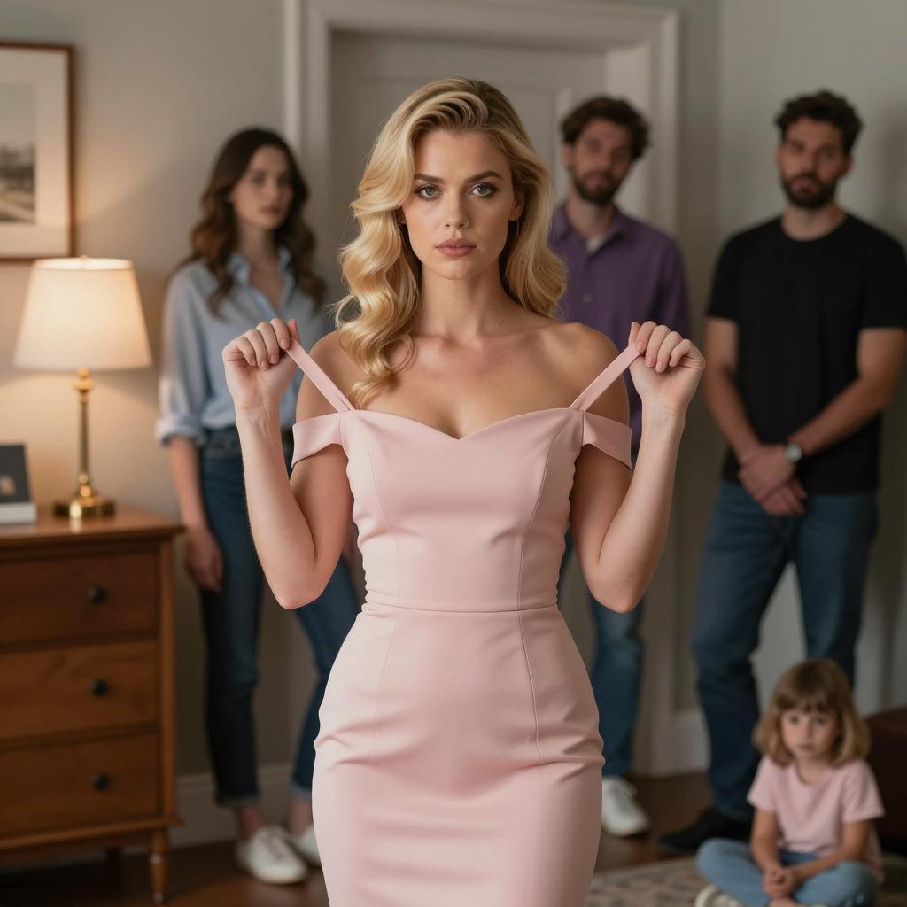Blonde woman with wavy hair, off-shoulder pink dress, holding dress straps, serious expression, center foreground. Background: three people, woman in light blue shirt, man in purple shirt, man in black shirt, standing in dimly lit room. Wooden dresser, table, lamp on wall. Child on floor.