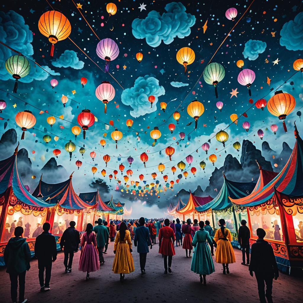 A surreal landscape of a whimsical parade of floating lanterns and dream-like figures, set in a world of acrylic and fog. Kaleidoscope of vibrant colors, hyper-realistic details, swirling clouds, and bright stars, intricate and fantastical