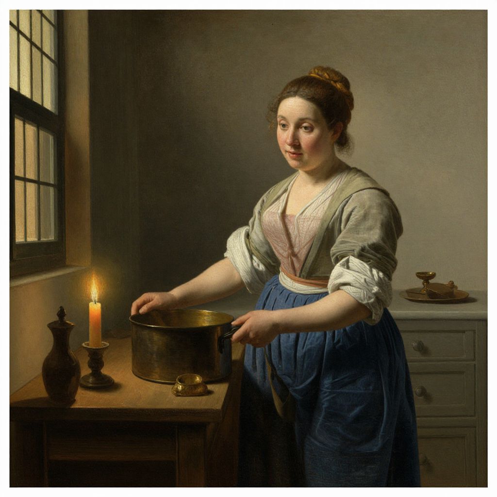 This is a digital painting in a classical, realistic style depicting a fair-skinned woman with brown hair tied in a bun, wearing a white blouse with rolled-up sleeves, a gray shawl, and a blue skirt. She stands in a dimly lit room, illuminated by a single lit candle on a wooden table to her left. She is holding a brass pot with both hands, placed on the table. The background includes a window with black bars on the left and a white chest of drawers on the right. The woman has a gentle expression, and the overall mood is warm and domestic.
