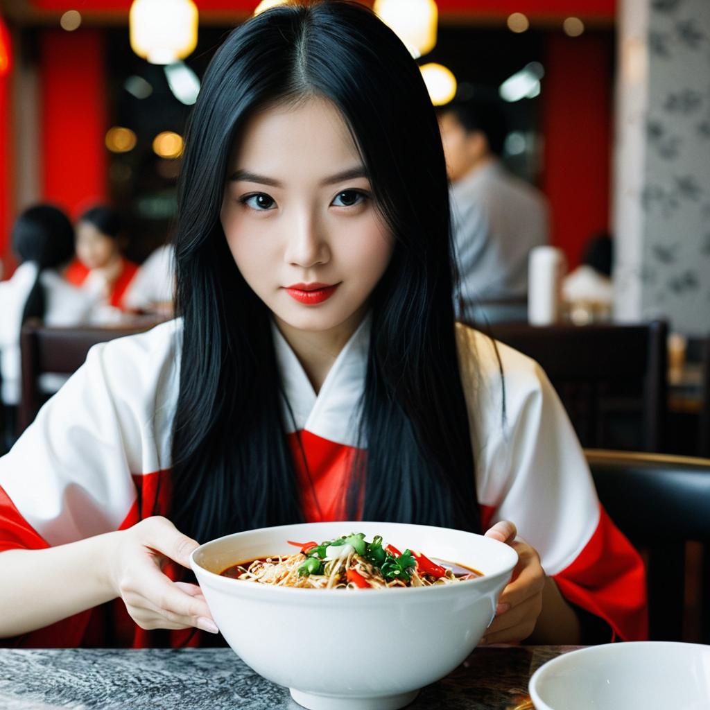 Chinese food fancy dress,1girl, food, long hair, looking at viewer, bowl, red lips, black hair, blurry background, blurry, chinese clothes, solo, indoors, solo focus, restaurant, realistic