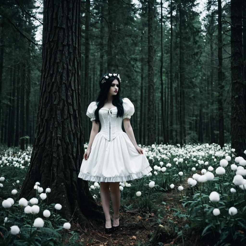 Goth snow white costume,1girl, solo, dress, black hair, long hair, tree, puffy sleeves, forest, outdoors, nature, flower, standing, puffy short sleeves, white dress, short sleeves, full body, corset, realistic