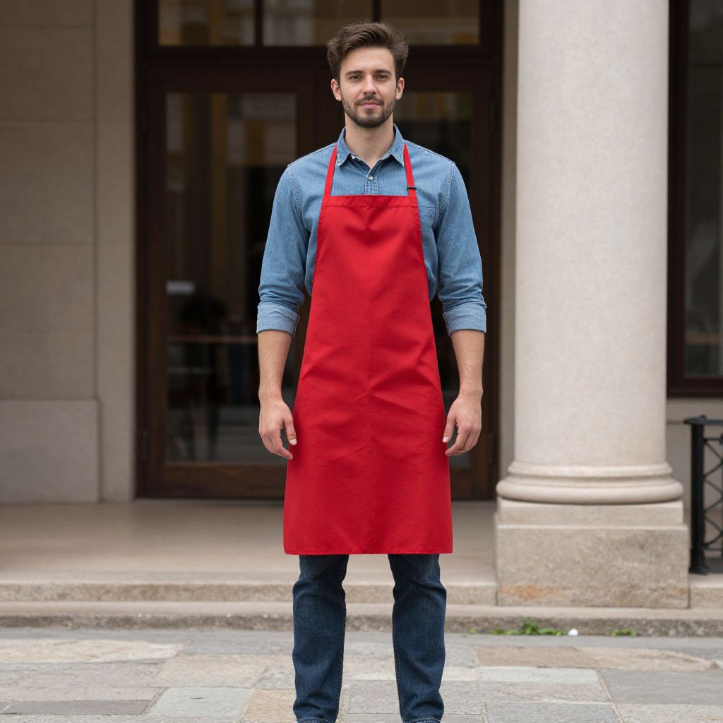 Redbat Jeans Costume, man in a red apron and blue shirt standing in front of a building