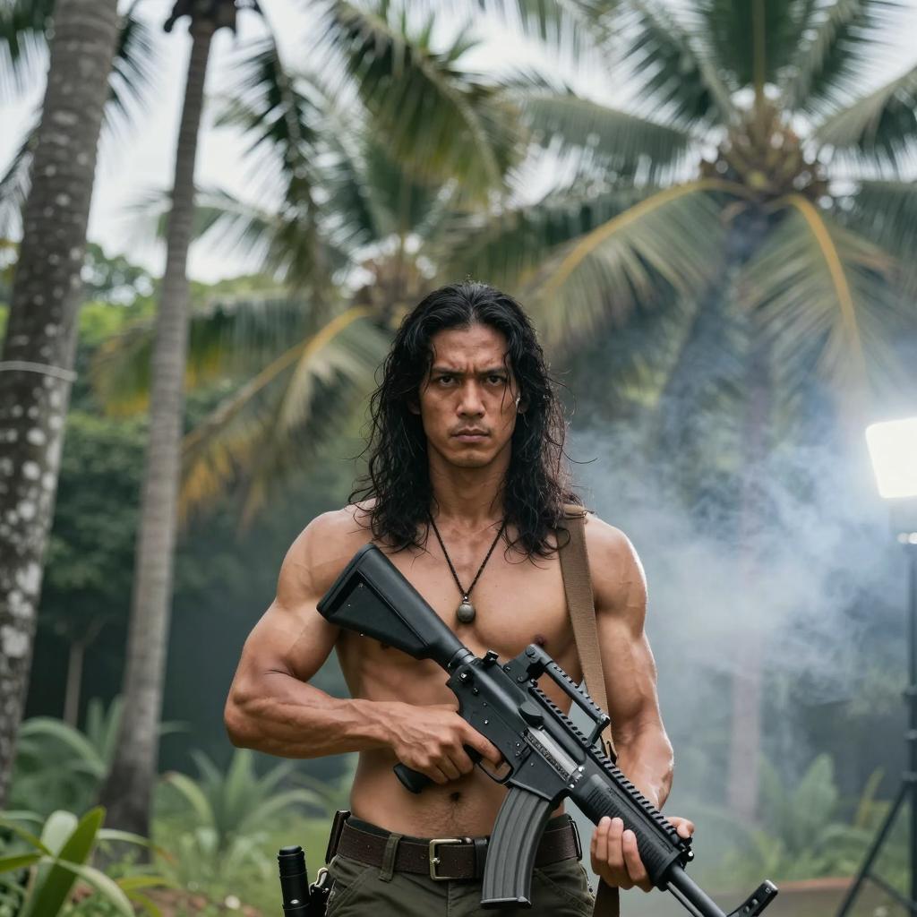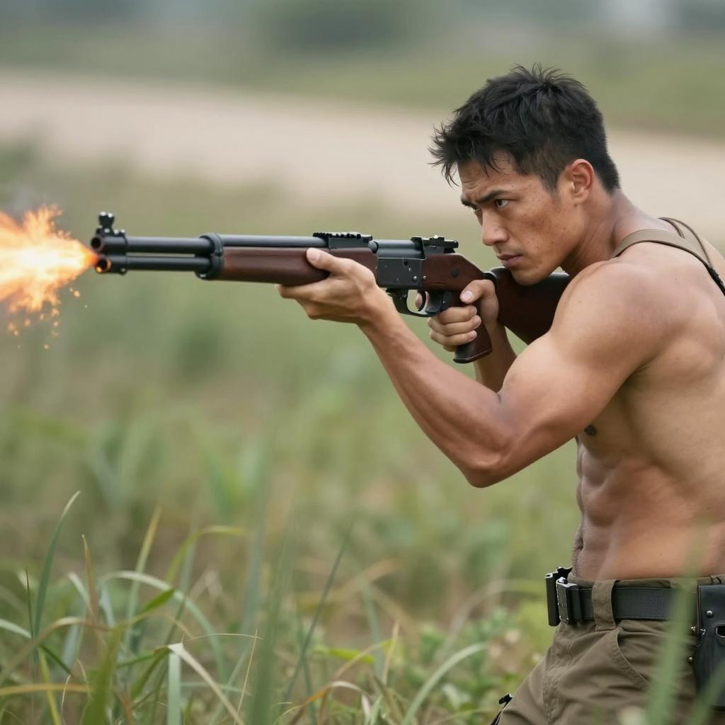 Muscular shirtless man with dark hair, intense expression, holding black rifle with firing flare. Outdoor grassy background, rifle muzzle flare. Man's right arm extended, left arm bent, gripping rifle. Blurred green grass in foreground, dirt path in background.