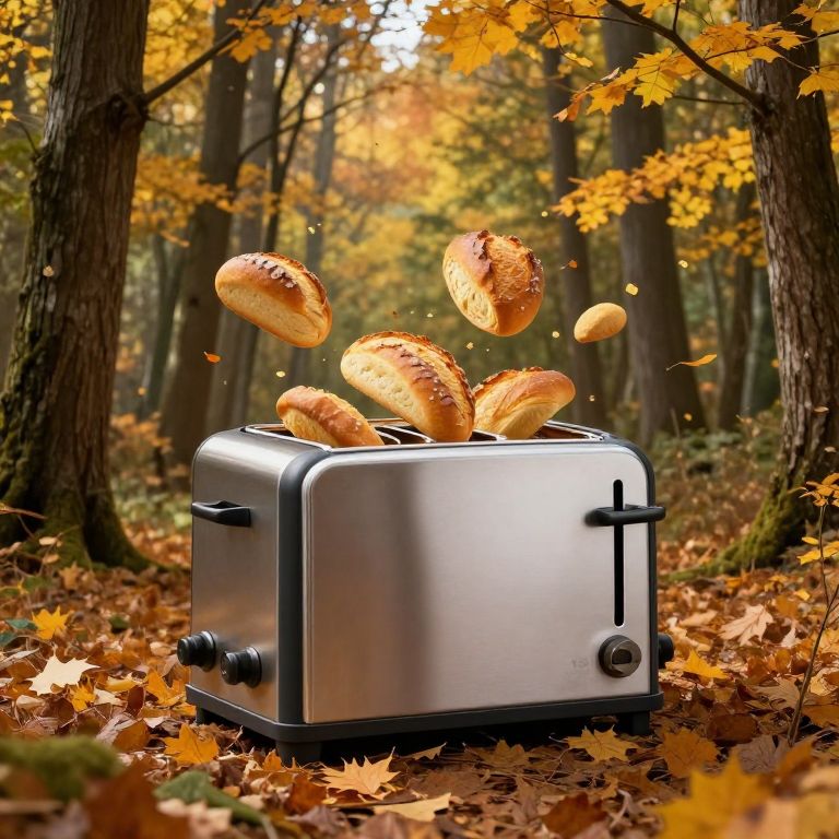 Photograph of a stainless steel toaster in an autumn forest, ejecting toasted bread with golden brown crusts amid yellow leaves.