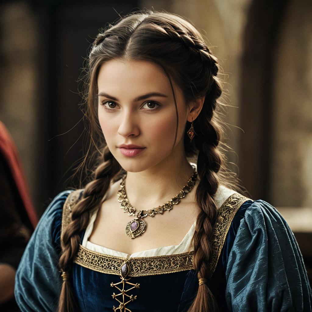 Portrait of a young woman dressed in an intricate medieval-style blue velvet dress with gold embroidery. She has long brown hair styled in braided pigtails and wears a detailed gold necklace with a purple pendant and matching earrings. The woman's expression is calm as she looks directly at the viewer against a softly blurred background.