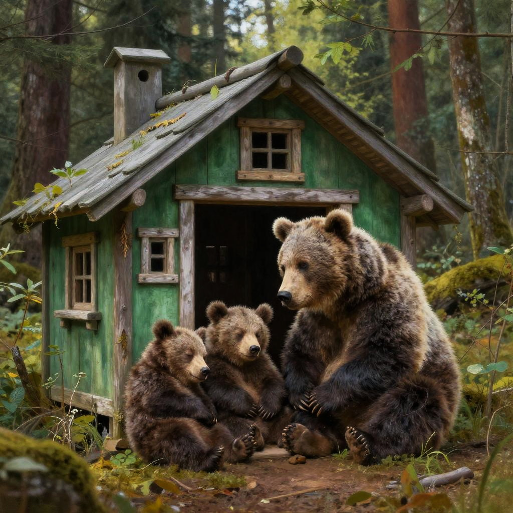 Masterpiece, a green hut in the forest, the brown bear cubs have fallen asleep there, and the youngest fidget bothers the gray-haired mother bear. perfect composition, beautiful detailed intricate, insanely detailed octane render trending on artstation, 8 k artistic photography, photorealistic concept art, soft natural volumetric cinematic perfect light, chiaroscuro, award - winning photograph, masterpiece, oil on canvas