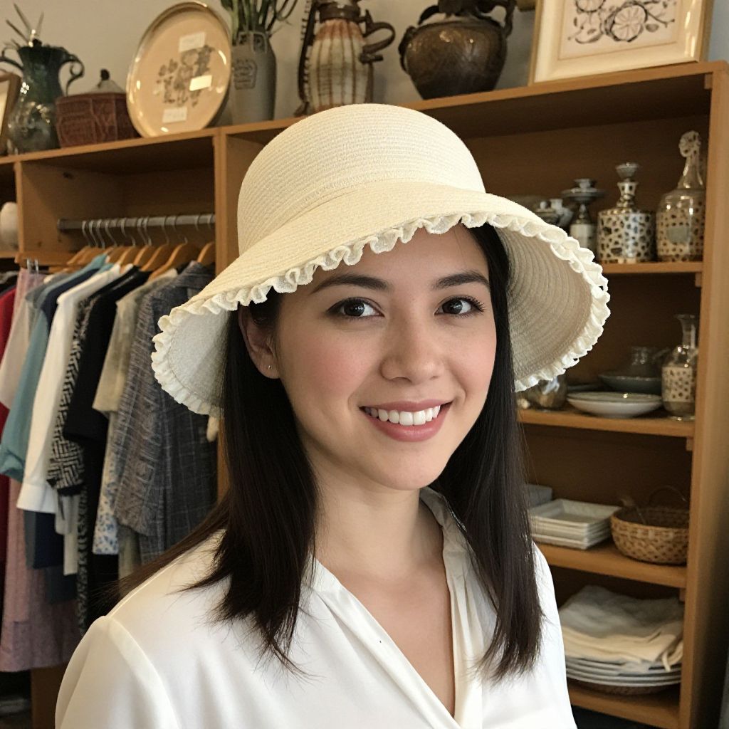 Woman wearing a cream-colored vintage chapeau with ruffled trim smiles warmly in front of a cozy shop interior featuring wooden shelves stocked with clothing and decorative items at Antique Sampler Mall in San Antonio, Texas.