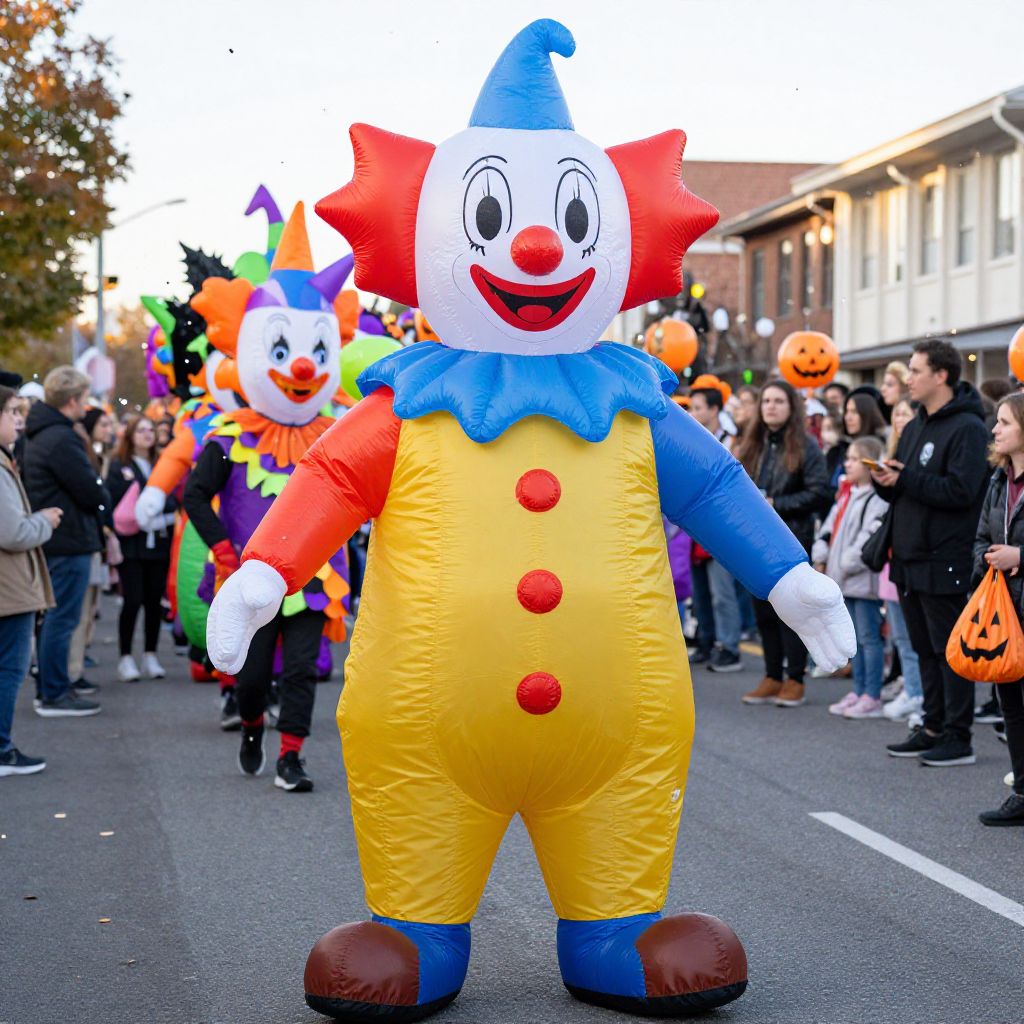 A wide-angle photograph of a man in a dramatic Gaston costume performing in a costume parade at a festive community event, the costume features a rich green coat, a golden sash, and a large ornate hat, the background shows a crowd of people in colorful clothing, with balloons and confetti floating in the air, the man has a broad face with a strong, defined nose and a warm, engaging expression.