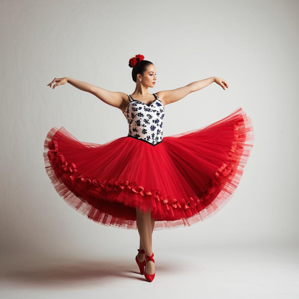Full-body wide-angle shot of a curvaceous flamenco dancer wearing a red tulle tutu and black polka dot bodice. The dancer poses with arms outstretched holding the tutu, standing on pointe in black ballet shoes and black tights. Her hair is styled in a tight bun adorned with a red flower, complemented by matching red earrings. Shot against a minimalist studio background with artistic inspiration from Henri Matisse and Wes Anderson.