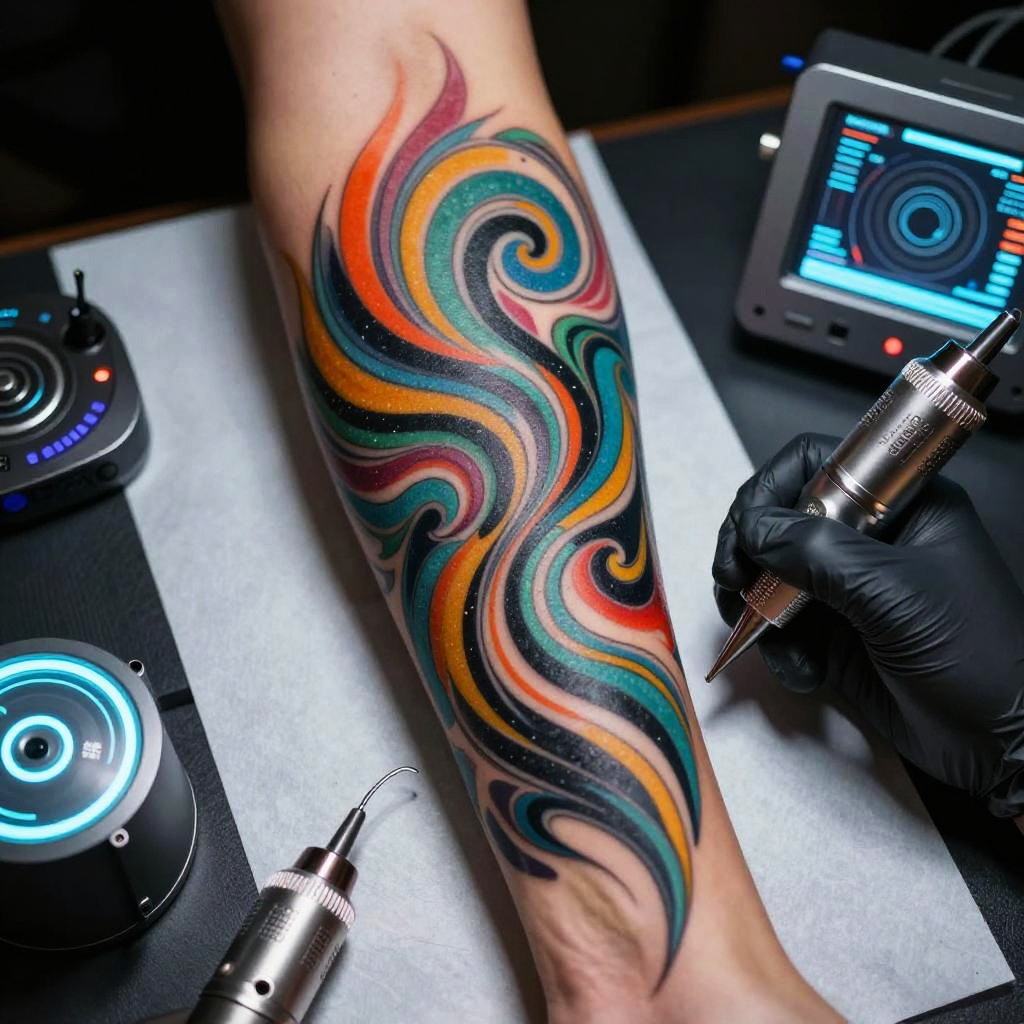 Photograph of a tattoo artist inking a colorful, swirl-patterned tattoo on a forearm, using a tattoo machine, with a digital tattoo device and