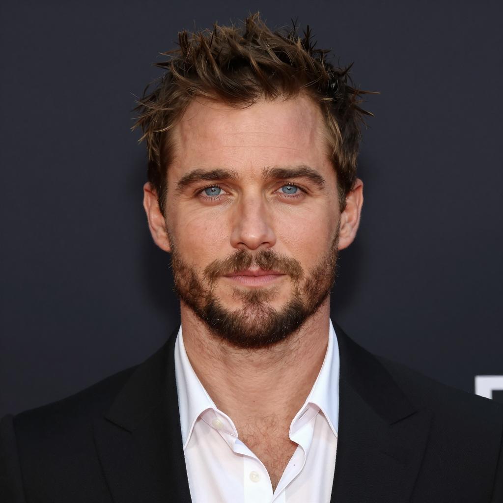Photograph of a handsome, blue-eyed man with short, tousled brown hair and a light beard. He's wearing a black blazer over a white, slightly unbuttoned shirt. The lighting is even, highlighting his facial features. The camera angle is straight-on, capturing a close-up of his face. The background is dark and blurred, putting the focus entirely on him. Depth of field is shallow.