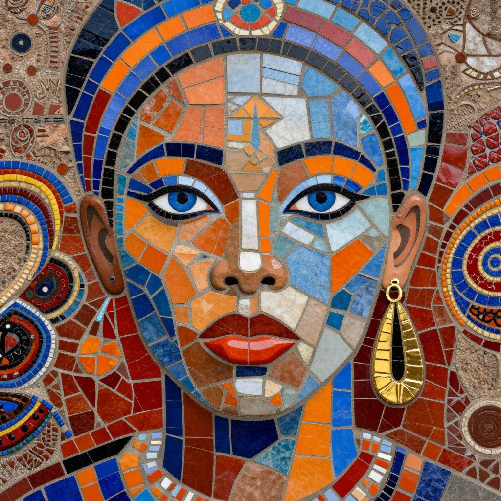 Vibrant mosaic portrait featuring a woman's face composed of colorful geometric tiles, showcasing bold blues, oranges, and reds, with intricate details including striking blue eyes, a gold earring, and a textured background inspired by African artistry.