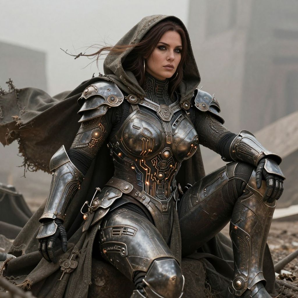 In a war-torn dystopia, a formidable female emerges, clad in sleek and battle-worn armor, adorned with glowing circuitry. (Draped in a tattered cloak that billows in the wind), this enigmatic woman possesses an aura of mystery and power, blending the elements of (futurism and desolation). 8k resolution detail, ultra-realistic, hyper detail, intricate, ornate, futuristic, using soft lighting, cinematic, masterpiece, Sitting down with legs crossed portrait, thick-waisted, fat tits