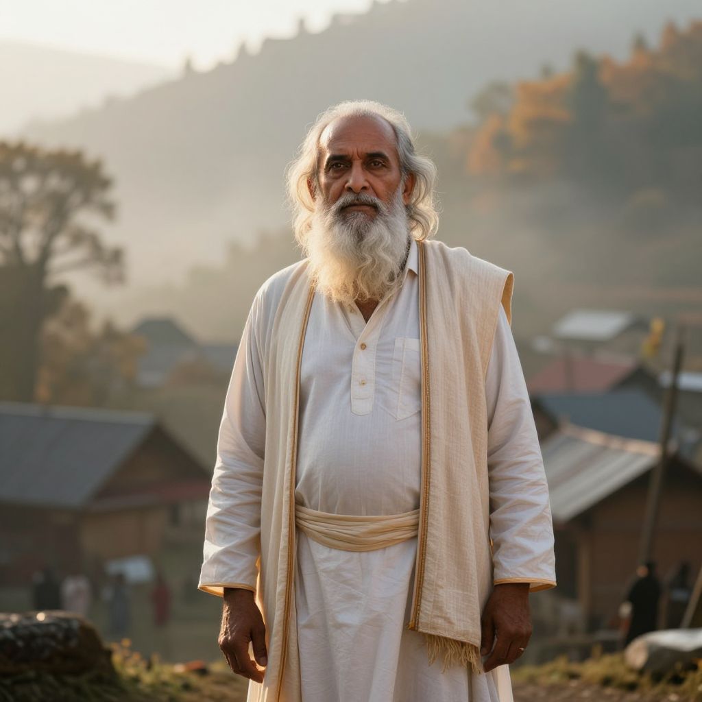 A wise elderly man with a long, flowing white beard that reaches his chest, wearing a brown robe adorned with elegant golden stripes, a soft white scarf neatly wrapped around his neck, and a vibrant yellow turban tied with precision at his head. His eyes are calm and deeply knowing, reflecting a lifetime of wisdom and quiet strength. He stands in a serene, ancient courtyard bathed in the golden hues of a rising sunrise, surrounded by weathered stone pillars, a tranquil garden filled with blooming jasmine and moss-covered pathways, and the gentle sound of rustling leaves. The atmosphere is peaceful, sacred, and full of quiet authority, exuding spiritual wisdom, stillness, and timeless insight.