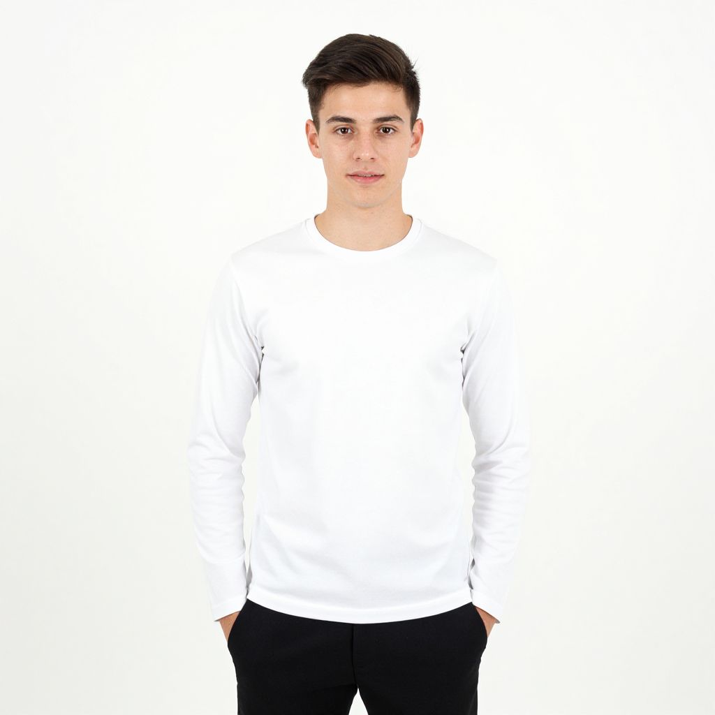 Photograph of a young man with short black hair, light skin, wearing a plain white long-sleeve shirt and black pants, standing against a