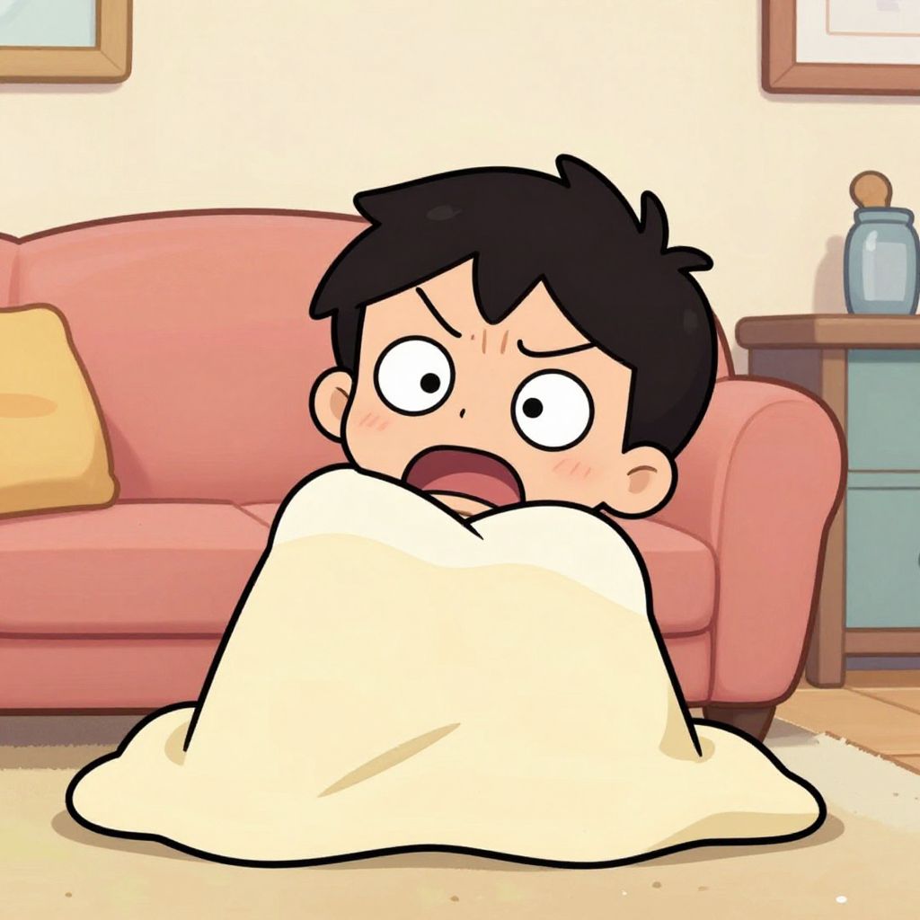 Kid scared cartoon hiding behind a couch in a cozy living room, clutching a blanket tightly, eyes wide with fear, exaggerated expressions, warm pastel colors, playful yet spooky atmosphere, comic book style with thick outlines and dynamic shading