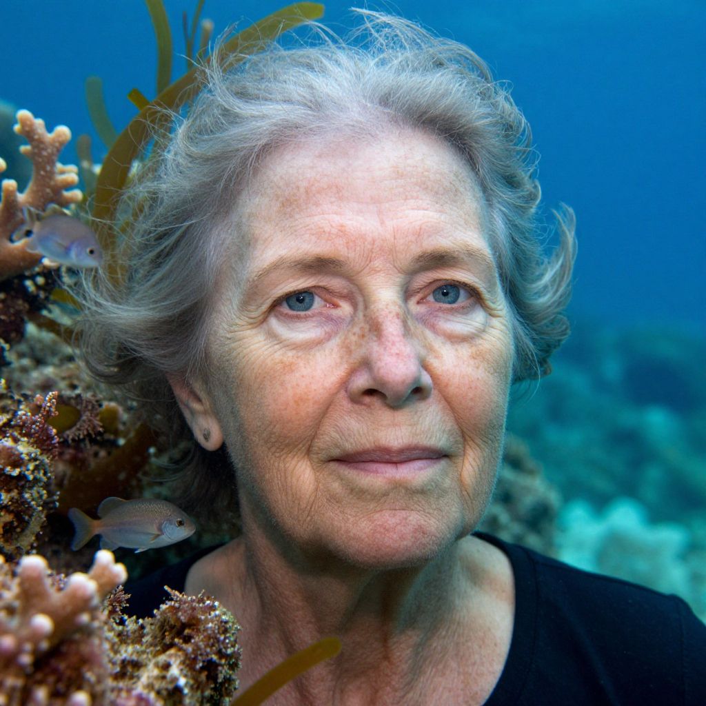 Photograph of an elderly woman with gray hair, blue eyes, and fair skin, underwater surrounded by coral and seaweed, looking thoughtfully upward.