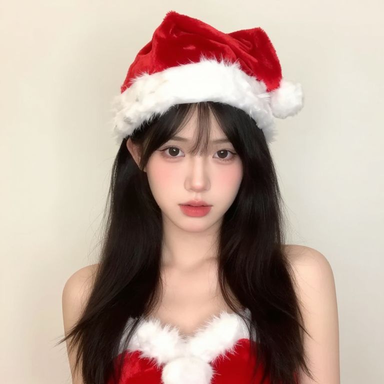 Female santa claus outfit with red and white fur and a red bow on her head.