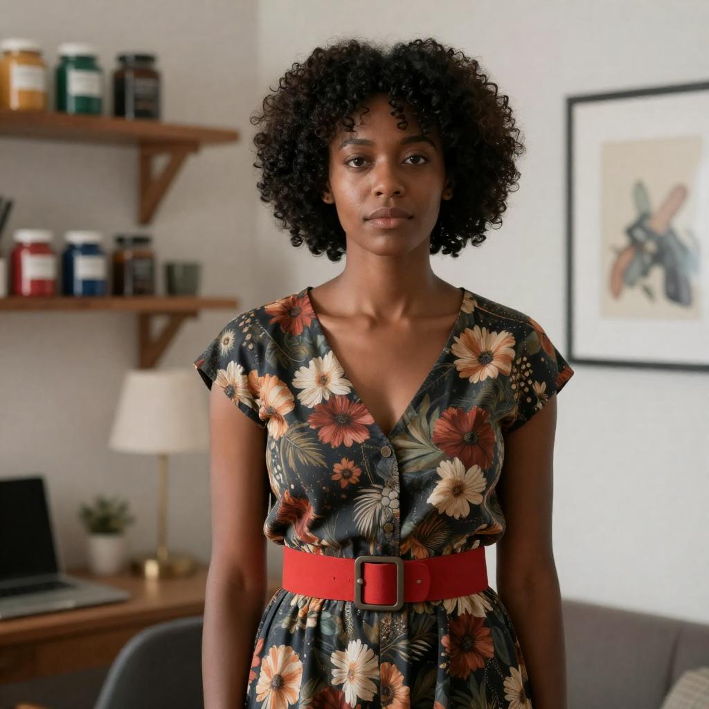 Digital character of a dark-skinned woman with an afro hairstyle, wearing a gold necklace and earrings, looking to the side. Background includes a modern room with colorful light reflections, orange sofa, and silhouetted figures on screens.