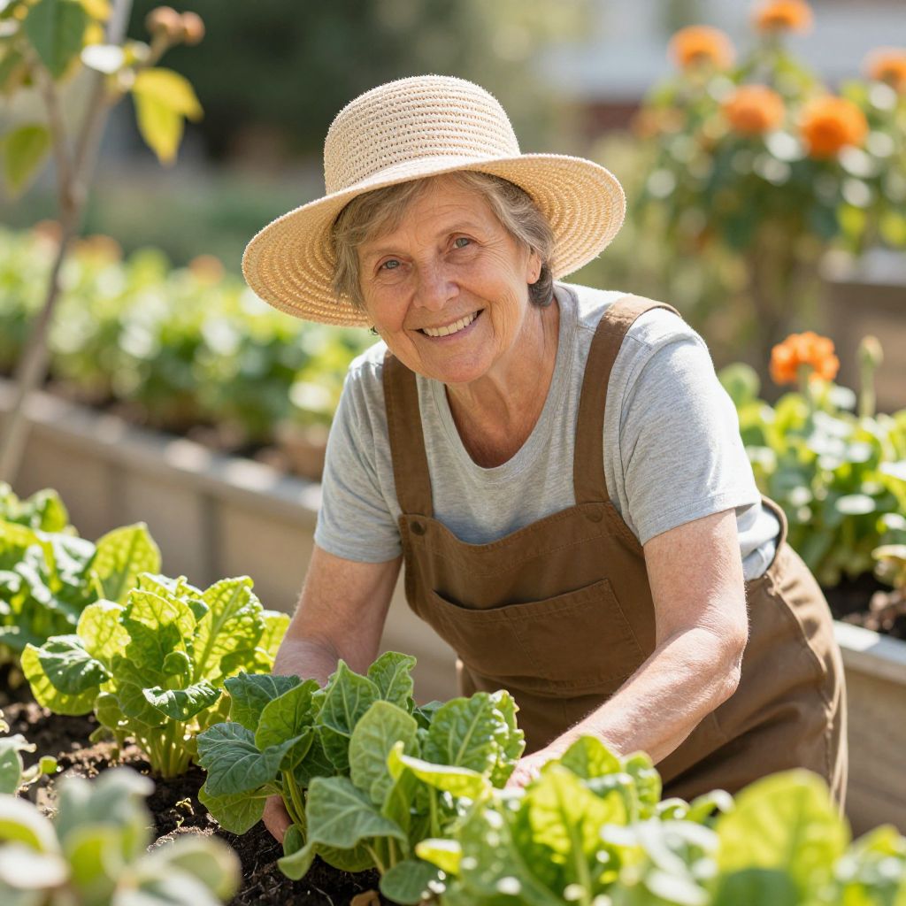 Photograph of an elderly woman with short gray hair, smiling warmly. She wears a light gray t-shirt under a brown apron and a wide-brimmed straw hat. She is bending over a garden bed filled with lush green leafy plants, her hands gently touching the soil. The background is a sunlit garden with blurred orange flowers and greenery. The image has a bright, natural light and a warm, inviting atmosphere. The woman's skin is fair, and the garden bed is bordered by a wooden frame.